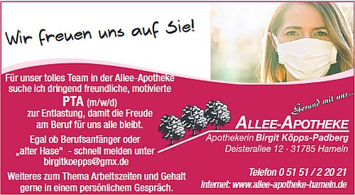 Für unser tolles Team in der Allee-Apotheke, suche ich dringend, freundliche, motivierte PTA (m/w/d)